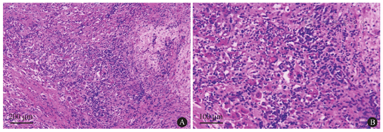 大量成熟浆细胞及少量淋巴细胞浸润,间质伴纤维组织增生及玻璃样变[HE染色,×100(A),×200(B)]
