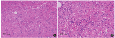 间质大量纤维组织增生,浆细胞及淋巴细胞浸润[HE染色,×100(A),×200(B)]
