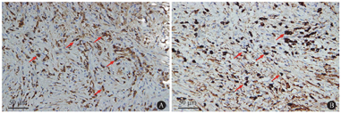 病例2:男性,61岁,因"胸闷、气短、双下肢水肿1月余"于2020年6月5日收入院。患者于入院前1个月无明显诱因出现胸闷、气短,持续约2 min,休息后缓解。伴有双下肢水肿、乏力。当地胸部CT检查提示两肺间质性改变,双侧胸腔积液,心包积液。既往合并高血压、糖尿病。入院查体:血压116/82 mmHg,心前区无隆起,心尖搏动未见异常,未触及震颤,未触及心包摩擦感,心界不大,心率80次/min,律齐,各瓣膜区未闻及病理性杂音。辅助检查:血常规、肝肾功能无明显异常,心肌损伤标志物未见异常;B型利钠肽升高(502.92 pg/ml);血沉升高(55 mm/第1小时),C反应蛋白升高(20.70 mg/L);IgG升高(21.40 g/L),IgA、IgM正常,IgE升高(181.00 IU/ml);补体C3正常,补体C4下降(0.11 g/L),类风湿因子升高(73.30 IU/ml),抗链球菌溶血素O(ASO)正常;抗核抗体谱、抗中性粒细胞胞浆抗体均阴性,抗心磷脂抗体(+),抗β2糖蛋白1抗体(+);CA125升高(140.60 U/ml);IgG4未查。腹部超声未见异常;心脏彩超示左房偏大,左室肌顺应性下降,左室收缩功能正常,少量心包积液,心包腔内透声欠佳,可见少许点状回声。初步诊断:心包积液、胸腔积液、慢性心力衰竭。给予胸腔置管引流,胸腔积液生化、常规检验未见异常;并予利尿等抗心衰治疗。治疗2周后患者胸闷无明显改善,仍有双下肢水肿,血压、心率较入院无明显变化。复查胸部增强CT提示心包增厚,心包积气、积液;双肺散在纤维灶,左肺上叶少许支气管扩张伴慢性炎症;双侧胸腔积液。考虑患者为缩窄性心包炎,转入心血管外科,行冠状动脉造影,提示冠状动脉单支病变,左回旋支远端狭窄50%,钝缘支开口狭窄70%;右冠优势。于2020年6月23日在全麻下行心包剥脱术,术中探查:壁层心包广泛明显增厚,心包膈面及左侧有少量钙化;心包腔广泛致密粘连,部分脏层心包也见轻度纤维化增厚,无钙化;房室大小基本正常;左侧胸腔内无粘连,胸膜外观正常,腔内有少量积液;右侧胸膜腔无积液或粘连,胸膜外观正常。纵隔胸膜、淋巴结及心包送检病理:镜下见心包壁明显增厚,间质大量纤维组织增生伴玻璃样变,并可见不等量的浆细胞及少量淋巴细胞浸润伴灶性出血,符合心包纤维硬化性炎性改变(图3)。心包组织免疫组化标记结果:CD38(浆细胞+),CD138(浆细胞少量+),IgG(浆细胞+)(图4A),IgG4+细胞>100/HPF,且IgG4/IgG>50%(图4B),考虑IgG4相关性疾病。患者最终诊断为IgG4相关性心包炎。术后予抗血小板、强心、利尿、胸腔引流等对症治疗,恢复良好出院。