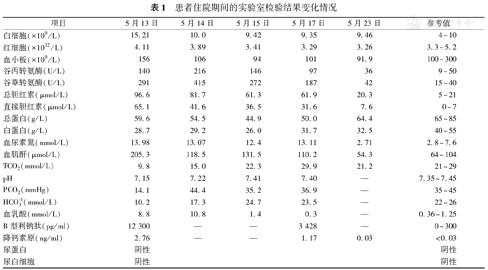 | 总胆红素(μmol/L) | 96.6 | 81.7 | 61.3 | 61.9 | 20.3 | 5~21 |