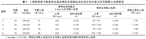 本组4例均为参加招收飞行学员医学选拔复选或定选的应届高中毕业生,均为男性,年龄18~19岁;发育正常,一般情况好,体育活动无不适感。内科查体各瓣膜区未闻及病理性杂音。平静时心电图示窦性心律,正常心电图。3 min登梯运动试验后2 min的长Ⅱ导联心电图示心率增快,QRS波时限增宽。即刻行全导联心电图,示心率有所下降,V1导联QRS波呈rsR'型,R'>r,TV1倒置,QRS波时限增宽。心电图诊断:运动后完全性右束支传导阻滞(complete right bundle branch block, CRBBB)。4例病例的基本情况及心电图具体特征见表1。