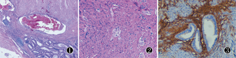 例1女,47岁,因"转移性右下腹痛3 d"入院。查体:腹软,右下腹压痛,反跳痛,轻度肌紧张,未触及包块,全腹叩诊呈鼓音,移动性浊音阴性,肠鸣音5次/min,结肠充气试验阳性。血常规检查:WBC 12.1×109/L,N 0.755。B超检查示:右下腹异常肠管回声。急诊行阑尾切除术,术中见阑尾盆腔位,盲端膨大,浆膜面呈紫褐色,有脓苔包裹,迂曲黏附于骨盆漏斗韧带,分离切除阑尾。例2女,54岁,反复右下腹痛3个月。以"急性阑尾炎"治疗后好转。8年前有"子宫内膜异位症和双侧巧克力囊肿"手术史。查体:腹软,全腹无压痛及反跳痛,全腹叩诊呈鼓音,移动性浊音阴性,肠鸣音5次/min,结肠充气试验阳性。CT检查示:肠系膜上动脉周围系膜模糊,阑尾无肿胀,腔内少量积气,子宫显示不佳,附件区未见异常密度影。术中见阑尾萎缩,右侧盆腔粘连严重,阑尾僵硬,与盲肠粘连,术中分离阑尾与盲肠。病理检查:大体阑尾无特殊,腔闭塞。在阑尾体和阑尾盲端各取材1片,见肌层内簇状增生的透明细胞,并且在浆膜面见1个灶腺管,怀疑阑尾类癌。病理检查:例1阑尾长7.5 cm,直径0.8 cm,腔闭塞,后半部分膨隆至直径达1.5 cm,内有充血性脓液,浆膜有脓苔覆盖。例2阑尾长3.5 cm,直径0.5 cm,腔闭塞,浆膜表面粗糙伴充血。光镜下见阑尾肌层及浆膜周围脂肪内散在分布不同大小的腺管,与阑尾黏膜无连接,管腔内衬立方和纤毛柱状上皮。例1盲端伴有急性坏疽性阑尾炎,肌层及浆膜内腺管腔内有出血,周围围绕子宫内膜样间质(图1)。例2阑尾黏膜基本完整,管壁内纤维脂肪组织增生,浆膜充血,腺管周围肌层内见增生的簇状分布的透明细胞,似阑尾类癌(图2)。免疫组织化学染色:2例阑尾壁肌层及浆膜面分布的腺管上皮CK7(+)、EMA(+)、ER(+)、PR(+)、CA-125(+)、CK20(-);例1局部腺管周围间质细胞CD10(+)(图3);例2肌层腺管周围增生的透明簇状细胞CK7(-)、Syn(+)、CgA(+)。病理诊断:例1,阑尾子宫内膜异位症伴急性坏疽性阑尾炎;例2,阑尾子宫内膜异位症伴阑尾周围慢性炎,阑尾壁内神经节细胞增生。