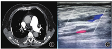 忠者女,75岁,主因间断右上腹胀痛伴恶心1个月余就诊。既往慢性支气管炎20余年,双下肢静脉曲张10余年。査体:脉搏105次/min,呼吸频率24次/min。双肺呼吸音弱,未闻及干湿性啰音,心律齐,各瓣膜听诊区未闻及杂音,腹平软,右上腹压痛阳性,无反跳痛,Murphy征阴性,未触及包块,双下肢无明显肿胀。急诊行腹部彩超:肝右叶单发囊肿,慢性胆囊炎。遂以"慢性胆囊炎急性发作"收住入院。入院后给予禁饮食、补液、抗感染等治疗,腹痛症状无明显缓解。期间血常规:WBC 4.8 × 109/L,中性粒细胞63.4%;动脉血气分析:PO2 48.9 mmHg,PCO2 36.3 mmHg。凝血系列: D-D 3 175 ng/ml,FIB 1.53 g/L。胸部CT:右肺上叶后段及下叶炎性病变,右侧胸腔积液,双侧胸膜增厚。心脏增大,心包增厚,肺动脉增宽。心脏彩超:右房、右室扩大,三尖瓣关闭不全(轻-中度),PAP 49 mmHg。追问病史,患者诉右小腿曾感憋胀不适。胸部CTPA示:双肺多发肺动脉栓塞(图1);肺动脉高压,右侧胸腔积液,右肺下叶膨胀不全,下肢静脉彩超:右侧小隐静脉血栓形成,双小腿肌间静脉、穿静脉血栓形成(图2)。确诊为肺栓塞,给予抗凝(低分子肝素)、活血等治疗,患者腹痛较前明显好转并出院,院外规律口服华法林抗凝治疗,无下肢肿胀、胸憋、气紧等症状。