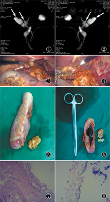 患者女,61岁。患者曾因右上腹胀痛于2018年8月23日在华中科技大学同济医学院附属同济医院就诊,腹部CT:胆囊稍增大,胆囊见结节状高密度影,胆囊壁稍增厚。诊断意见:胆囊结石并胆囊炎。患者拒绝手术,行保守治疗后症状缓解。半月后再次出现右上腹胀痛入我院。查体:皮肤巩膜无黄染,腹平软,右上腹压痛,无反跳痛,Murphy征阴性。血常规、肝肾功能、胸片未见明显异常。腹部彩超示:胆囊切面大小正常,壁欠光滑,胆囊腔内可见强回声光团,后伴声影。为进一步明确肝内外胆管是否有结石存在,行MRCP检查,MRCP示:肝内外胆管未见狭窄、梗阻及扩张。见双胆囊(图1,图2),壁厚,双胆囊腔内可见结石。完善围手术期准备,患者于2018年9月18日行腹腔镜胆囊切除术(laparoscopic cholecystectomy,LC),术中探查见胆囊管开口于胆总管右侧壁,分离出胆囊管及胆囊动脉并夹闭切断,继续向肝门部分离胆囊壶腹部时见一囊性畸形物,结合术前MRCP结果考虑为变异"小胆囊"(图3,图4),术中证实为双胆囊,两胆囊有各自的胆囊管分别与胆总管相通,两胆囊致密相连,外有结缔组织包裹。术后检查"大胆囊"约8 cm×2 cm大小,内含黄褐色胆汁,腔内见一枚直径约2 cm×1 cm褐色结石,"小胆囊"约2 cm×1 cm大小,无明显胆汁,腔内为填满型直径约0.2 cm白色小结石(图5,图6)。术后8 d出院。病理:光镜下较大胆囊与较小胆囊壁内见炎细胞浸润,囊腔内见结石(图7,图8),诊断:(1)胆囊结石症;(2)慢性胆囊炎。