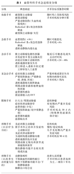 | 亚急诊手术 | 症状性腹主动脉瘤严重肢体缺血(严重静息痛、溃疡、坏疽) 透析通路相关肢体缺血周围动脉旁路移植物血栓性闭塞血管源性感染需滤器植入的DVT | 严重疼痛或器官失功短期内病情可恶化手术时机1周内 |