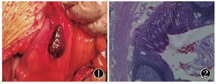 患者女,38岁。以"右下腹疼痛2 d"为主诉入院。超声检查提示:阑尾区肠间隙探及范围约2.7 cm×1.9 cm液性暗区。诊断为阑尾炎。对症治疗后疗效欠佳,逐步出现全下腹部疼痛,伴低热。既往有"慢性阑尾炎病史"5年。查体:BMI:27.34 kg/m2。下腹部压痛、伴肌紧张及反跳痛。实验室检查:外周血白细胞6.64×109/L,中性粒细胞4.48×109/L, Hb 153 g/L,血小板167×109/L。盆腔CT检查:回盲部肠管不均匀增厚,周围脂肪间隙内可见较多淋巴结显示。左下腹部肠管管壁明显增厚,周围脂肪间隙内可见渗出性密度影,周围血管及肠系膜聚集。因患者体征严重,但外周血白细胞不高,术前考虑乙状结肠肿瘤的可能。急诊行剖腹探查术。术中见盆腔及肠间隙黄色积液约50 ml,阑尾尖端约2 cm及系膜充血水肿,乙状结肠冗长并见1个肠脂垂出血形成血肿,周围结肠系膜充血水肿(图1)。术中诊断为:慢性阑尾炎急性发作、急性肠脂垂炎。行阑尾切除术、肠脂垂切除术。切除肠脂垂后发现其根部血管血栓形成,行漏气试验确定结肠无穿孔后包埋肠脂垂创面。病理检查示:慢性阑尾炎急性发作、脂肪组织内血管扩张充血及出血(图2)。