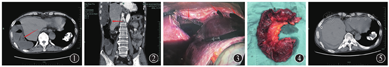 患者男,68岁。因"上腹部胀痛2 d,加重伴呕吐6 h"急诊入院。查体:心率106次/min,呼吸23次/min。急性痛苦貌。右下肺呼吸音减弱,上腹部可及压痛,轻度反跳痛,肠鸣音约6次/min。实验室检查:白细胞12.9×109/L,中性粒细胞百分数87.1%。给予禁食、胃肠减压、补液、抗感染等治疗。急诊全腹部增强CT:肝右侧形态不规则,部分小肠疝入右侧膈部,小肠肠管积气、积液伴气液平,提示小肠梗阻(图1, 图2)。完善术前准备后急诊全麻下行腹腔镜探查:术中见部分右肝及约80cm小肠经右侧膈肌裂孔疝入右侧胸腔,周围充血水肿及中等量暗血性液体渗出,扩大疝环回纳内容物,发现小肠疝入胸腔部分已坏死;膈肌严重发育不良,多处较大缺损并与胸腔相通,仅部分薄膜或束带状连于右肝表面(图3)。坏死小肠段切除端端吻合(图4),胸腹腔内反复大量生理盐水冲洗,右侧胸腔放置胸腔闭式引流l根。考虑小肠部分坏死,腹腔内有污染可能,故外侧及前侧膈肌缺损处分别采用8 cm×15 cm生物补片各1片修补,以Prolene线间断缝合方式将补片缝合于膈肌边缘及肝脏附着部或适当缝合肝包膜上。术后经ICU治疗2 d后转回普通病房,继续禁食、胃肠减压、抗感染、补液、适当营养支持治疗。术后第4天肛门排气,第5天拔除胃管,逐步恢复饮食后第8天拔除腹腔引流管,第10天复查胸部+上腹部平扫CT:右侧胸腔少量积液,右肺基本复张,右肝大部归于正常位置(图5),第12天拔除胸管,第16天痊愈出院。术后病理提示小肠段出血性梗死。随访至术后2年余,未复发。