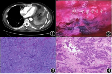 患者男,54岁,因“胸痛、胸闷2周”入院。吸烟史20余年。查体:消瘦体型,左胸部呼吸动度及语颤较右侧减弱,叩诊左肺浊音,听诊左肺呼吸音减弱。胸部CT检查示:左侧胸腔大量积液,左肺压迫性肺部张。血清肿瘤标志物:糖类抗原CA125:235.4 U/ml,甲胎蛋白:1.4 ng/ml,癌胚抗原:4.68 ng/ml,糖类抗原CA72-4:17.28 U/ml。行床边左侧胸腔闭式引流术,引流出淡黄色液体,胸水常规生化检查:白细胞计数722.0×106/L,L-乳酸脱氢酶:803 U/L,腺苷脱氨酶:12 U/L,葡萄糖:5.7 mmol/L,胸水癌胚抗原定量 49.47 ng/ml。胸水病理检查示:恶性上皮源性肿瘤。支气管纤维镜检查示:左肺支气管炎症。胸、腹部增强CT检查示:左侧胸膜广泛不规则增厚,左侧胸腔包裹性积液,左肺组织压迫性肺不张(图1)。留置胸腔引流管。为缓解症状及明确病理诊断,行胸腔镜下左胸腔包裹性积液清理+胸膜活检+胸膜闭锁术。术中见左侧胸腔内粘连形成多个包裹性腔隙,胸膜广泛水肿,多发菜花赘生物,触之易出血(图2)。予钝性分离胸腔粘连,打开包裹腔隙,清除淡黄色积液,取病变胸膜及肿物各1块送病理检查,滑石粉均匀喷洒胸腔,行胸膜闭锁术。术后病理学检查结果:胸膜组织及肿物中见低分化腺癌组织浸润性生长(图3,4)。免疫组化染色:CK8/18(+),CK20(-),CK19(+),Vimentin(-),D2-40(-),WT1(-),CD7(-),PSA(-),CK5/6(-),AFP(-),Hepatocyte(+),CD34(血管+),符合转移性肝细胞性肝癌或肝样腺癌。患者术后胸部症状缓解,拒绝放化疗,于出院后第5周再发胸闷等不适,带瘤生存仅4个月。