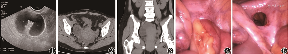 患者女,44岁,因腹痛1 d入院。伴呕吐1次,无腹胀,无肛门停止排气排便。查体:右下腹触及一5 cm × 5 cm大小包块,压痛阳性。实验室检查:白细胞10.8 × 109/L。患者既往2次分娩史,10余年前有剖宫产史,术后恢复可。急诊经阴道超声检查示盆腔右卵巢外侧方见52 mm × 41 mm液性暗区,壁厚,考虑扩张肠管可能(图1)。腹部CT示右侧附件区约47 mm × 35 mm类圆形囊性灶,周围脂肪间隙欠清,盆腔见不规则片状积液;盆腔小肠稍扩张积液(图2、3)。急诊行腹腔镜下探查术,术中见盆腔内约50 ml淡血性液,右侧子宫阔韧带见一3 cm × 3 cm缺口,部分小肠嵌顿其内,血供基本正常(图4、5),左侧卵巢表面见0.5 cm × 0.5 cm子宫内膜异位结节。完整牵拉出阔韧带内嵌顿小肠,血供颜色正常。术后诊断:子宫阔韧带疝。该患者术后恢复良好,术后4 d出院。