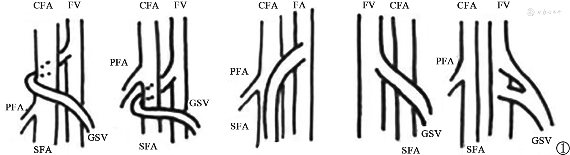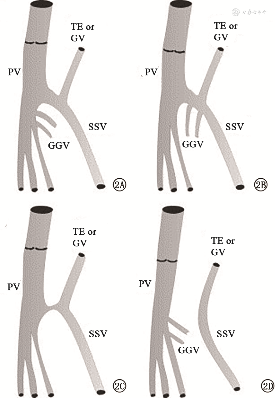 国外有文献报道在1 563例下肢静脉疾病患者的2 552条肢体中,6条肢体在隐股交界处(sapheno-femoral junction,SFJ)观察到解剖变异(0.24%),将隐股交界处解剖变异分为5型,如图1,最常见的解剖变异是穿过股总动脉后方的大隐静脉[6]。而隐腘交界处解剖变异更常见,除小隐静脉直接汇入腘静脉外,国外有报道[7]隐腘交界处常见解剖变异可分为3型(图2)。文献报道隐腘交界处通常位于腘窝皮肤折痕5 cm内。但其水平可变,常见于腘窝皮肤折痕上方2~4 cm处,有25%高于该水平,很少低于腘窝皮肤折痕[7]。基于隐股/隐腘交界处可能存在解剖变异,术者应熟悉局部解剖,建议术前常规完善超声评估,明确有无解剖变异,开放手术中需精细操作,必要时采用术中超声引导。出血是血管损伤的常见症状,术中如有出血应避免盲目钳夹或缝扎血管。术后可行动脉搏动检查以除外动脉损伤。如发生股/腘动静脉损伤,应及时重建,必要时寻求有经验的血管外科医师帮助。