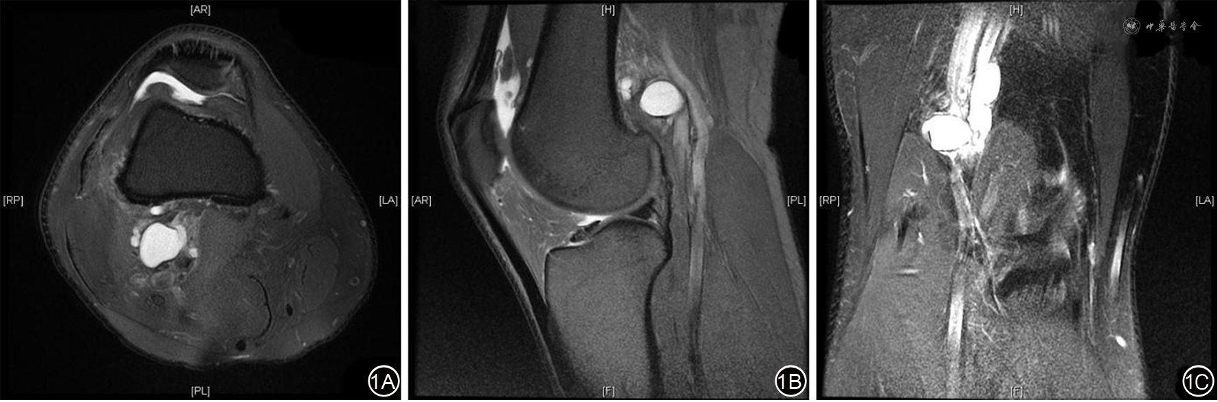 患者男,49岁,因右下肢间歇性跛行2月余入院。该患者2个月前无明显诱因,行走或跑步运动后出现右小腿疼痛麻木,休息后可缓解,症状反复出现,现跛行距离约200 m,无静息痛。入院查体:右下肢股动脉搏动正常,腘、足背和胫后动脉无法触及搏动。入院前超声检查:右侧股浅、腘、胫后和腓动脉流速减低,频谱形态改变,三相波消失。CT血管三维成像示:右侧腘动脉P1段重度狭窄,腘动脉后外侧受压。膝关节MRI示:腘动脉后外侧见一类圆形异常信号影,边界清晰,T2WI高信号,大小1.7 cm×2.5 cm,长约3.1 cm(图1)。初步诊断:腘动脉陷迫综合征(popliteal artery entrapment syndrome,PAES)、腱鞘囊肿(ganglion cyst,GC)。硬膜外麻醉下行右侧腘动脉解压+囊肿切除术。术中见腘动脉被股二头肌肌腱长头远端内侧面的肌腹内囊肿压迫,囊壁表面光滑,质韧,内容物为淡黄色胶冻样。囊肿切除后行术中超声示腘动脉流速、三相波恢复正常,结束手术。术后病理符合腱鞘囊肿的病理特征。术后4个月随访,右侧股、腘、足背和胫后动脉搏动正常,下肢血管超声检查未见明显异常。