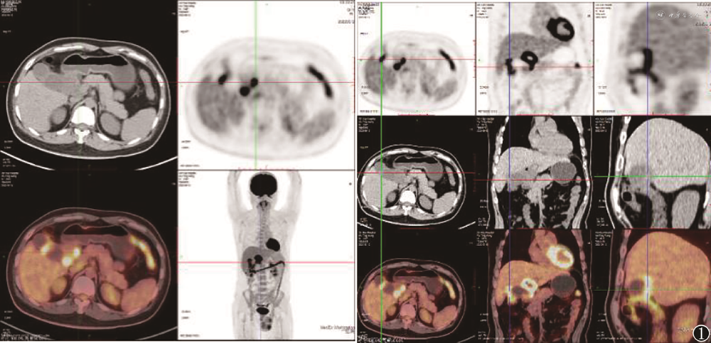 患者男,34岁,因“上腹部疼痛2月余”入院。入院前2月余饱餐后出现中上腹钝痛,疼痛呈进行性加重,无恶心、呕吐、呕血、腹胀、皮肤瘙痒等不适。外院CT示肝门部囊状病变伴肝内胆管扩张,胆囊结石。肝功能:总胆红素109.0 µmol/L,碱性磷酸酶380.0 U/L。予以保肝治疗后症状无明显缓解。2个月后复查上腹部CT及MRI均提示:胆囊癌累及邻近肝实质可能。复查肝功能:总胆红素19.8 µmol/L,碱性磷酸酶279.0 U/L。患者为寻求进一步治疗入我院。入院后上腹部增强CT:胆囊壁增厚,肝门区胆管壁增厚,考虑恶性,伴临近肝实质累及,肝内胆管扩张,肝门区淋巴结转移;胆囊结石。PET-CT示:胆囊壁不均性增厚,高代谢改变,考虑胆囊癌,并肝门区转移灶(胆管受累可能),侵及邻近肝脏及结肠,肝门区淋巴结转移(图1)。肝功能:总胆红素8.9 µmol/L,谷氨酰转移酶205.0 U/L,余正常。肿瘤指标正常。查体无殊。初步诊断为:胆囊占位性病变,胆囊结石。多学科讨论认为:行保肝等治疗后患者黄疸及肝功能好转,肿瘤标志物未见明显异常,临床表现与恶性肿瘤不符,但患者影像学表现提示胆囊癌并发胆管癌可能性大,PET-CT提示胆囊癌,并肝门区转移灶(胆管受累可能),侵及邻近肝脏及结肠,肝门区淋巴结转移。患者为年轻男性,建议行超声引导下穿刺或腹腔镜下活检明确病理,根据病理结果决定下一步治疗方案,如为恶性,建议行新辅助化疗后行手术切除。遂行超声引导下病理穿刺,因肝门区界限不清,穿刺损伤胆管风险较大,中止操作。完善术前检查后行腹腔镜探查术,腔镜下见胆囊大小约8 cm×6 cm×4 cm,胆囊三角欠清晰,与邻近组织粘连致密,肝十二指肠韧带与大网膜粘连致密。行开腹探查术,取上腹部正中切口,经解剖后,见胆囊三角粘连致密,解剖肝十二指肠韧带,见肝4b段直径3 cm大小脓肿,打开脓肿吸出大量脓液,冲洗脓腔,探查脓腔与胆道不相通,决定对肝脓肿仅行切开引流。游离胆囊底体部至胆囊管,缝扎胆囊管开口,切除胆囊。胆囊床电凝止血。取出标本,见胆囊内结石数枚。术中冰冻病理:黄色肉芽肿胆囊炎。术后病理:黄色肉芽肿胆囊炎。术后恢复可,终至出院。