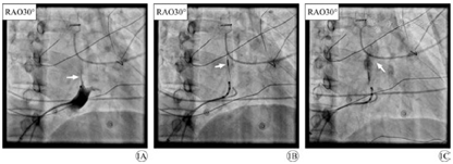 Marshall组患者行VoM-Et,经右侧股静脉途径将SL1长鞘(美国雅培公司)送至下腔静脉,沿着长鞘送入右冠状动脉指引导管(JR4,美国强生公司)至冠状静脉窦(coronary sinus,CS)开口至CS内寻找VoM,顺钟向旋转直至VoM开口,右前斜30°X线透视下使指引导管头端指向后上方向,注射造影剂,寻找VoM开口并造影明确VoM走行。沿指引导管将0.014 in(1 in=2.54 cm)×190 cm的BMW导丝(美国雅培公司)送至VoM远端,沿导丝缓慢送入OTW球囊(美国波士顿科学公司),使用规格根据患者VoM情况决定。至VoM远端,以6~10个大气压球囊扩张,继之缓慢回撤BMW导丝,沿球囊管腔注射造影剂观察VoM走行,观察无造影剂反流回冠状静脉内,确保VoM封堵完全。经OTW球囊注射无水乙醇2~4 ml至VoM,观察1 min后逐渐缓慢回撤球囊至VoM中段及近端,重复上述过程2~3次,每次间隔1 min,累计注射无水乙醇6~10 ml[5]。