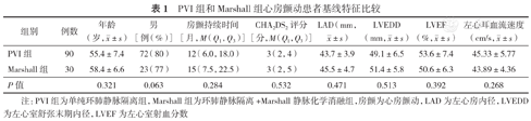 注:PVI组为单纯环肺静脉隔离组,Marshall组为环肺静脉隔离+Marshall静脉化学消融组,房颤为心房颤动,LAD为左心房内径,LVEDD为左心室舒张末期内径,LVEF为左心室射血分数