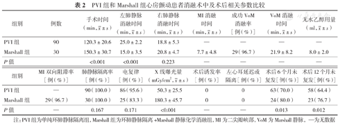 PVI组和Marshall组心房颤动患者消融术中及术后相关参数比较