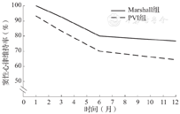 术后6个月随访中,72.5%(87/120例)患者在未服用抗心律失常药物情况下无房颤/房速发作,其中Marshall组24例(24/30,80.0%),PVI组63例(63/90,70.0%),两组比较差异有统计学意义(P=0.013,表2、图5)。术后12个月随访,67.5%(81/120例)患者在未服用抗心律失常药物情况下未再出现房颤/房速,其中Marshall组23例(23/30,76.7%),PVI组58例(58/90,64.4%),两组比较差异有统计学意义(P=0.012,表2、图5)。39例(39/120,32.5%)复发患者中,房颤32例、房速7例,其中10例患者在随访期间接受2次消融,其余患者选择药物治疗房颤。随访期间,Marshall组患者出现1例轻微鼻出血;PVI组患者出现1例鼻出血、1例消化道出血,均较轻微。两组患者均未出现与手术相关不良事件(动静脉瘘、心包积液等)。
