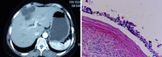 肝脏纤毛前肠囊肿(ciliated hepatic foregut cyst, CHFC)非常罕见。Friederich[1]于1857年首次描述该病。他当时推断该病为先天性胚胎发育异常所致。1984年Wheeler和Edmondson[2]将其命名为"肝脏纤毛前肠囊肿"。此后文献报道增多,该疾病逐渐被临床医师所认识。国内蔡秀军等[3]于2003年首例报道CHFC,以后国内又报道2例[4,5]。本例为国内报道的第4例。国内发病者Pathology-Research and practice杂志亦报道1例[6]。纤毛性前肠囊肿多发生于纵隔,一般为气管支气管源性或食管源性,极少发生于肝脏。肝脏纤毛前肠囊肿囊壁由4层结构组成:内衬假复层柱状上皮层(穿插黏液细胞)、上皮下结缔组织层、平滑肌层和外层纤维囊[2]。囊壁发达的肌层是本病的特征,也是与其他囊性病变鉴别的重要标志。囊肿内面光滑,但有微细小梁结构,与周围的肝实质间存在纤维性包膜。囊肿的内面有时可见皱缩,可能系囊壁平滑肌收缩的结果。内容为白色或褐色黏稠液体。一般为孤立、单房,无胆汁成分,直径小于4 cm,好发于肝左叶内侧区S4段[7],其次发生在肝S5和S8段或附着于胆囊床[4]。大多数患者没有症状,常在影像学检查或外科手术中发现,偶见因囊肿内出血而突然发病[7]。Sharma[8]和Fujita[9]报道有多房、葡萄样多囊及含胆汁囊肿,囊肿直径也相对较大,多见于儿童或早期出现症状的患者。文献报道目前已有5例CHFC恶变为鳞状上皮细胞癌[10]。Ben Ari[11]和Bishop[12]近期报道有的患者CA-199和CEA增高。Grizzi[13]报道4例CHFC内膜纤毛细胞中癌症/睾丸精子抗原蛋白17(sp17)和AKAP-相关精子蛋白(ASP)表达。因此,若CHFC患者上述检验异常,则可疑转变鳞状细胞癌的倾向,应积极治疗。CHFC需要与单纯肝囊肿、肝包虫病、子宫内膜异位性肝囊肿[14]等鉴别诊断。单纯肝囊肿超声示单发或多发、类圆形无回声区、囊壁薄而清晰,CT示边界锐利光滑、囊内密度均匀的低密度影,CT值与水接近。肝包虫病患者有疫区生活史,超声示类圆形液性暗区并可见分隔,随体位而改变,CT示边界清楚之液性暗区、子囊分隔及包膜钙化,结合免疫学检查可予鉴别。子宫内膜异位性肝囊肿罕见,发病年龄生育期相对多见,呈持续性或月经周期性右上腹痛,结合影像学检查可予确诊。