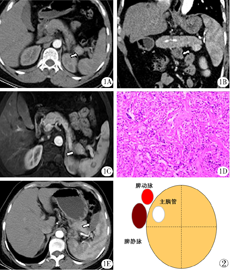 例1,女性,44岁。因"反复发作性出汗、心慌、乏力4年余"入院。无心、肺、肾等重要脏器疾病史,查体无阳性体征。随机末梢血血糖2.4 mmol/L;空腹血糖1.73 mmol/L;糖化血红蛋白3.30%;空腹血清胰岛素372.63 mU/L。增强CT见胰尾部类圆形等密度结节,动脉前期、动脉期明显强化,强化幅度高于正常胰腺组织,大小1.8 cm×1.7 cm,边缘清晰(图1A)。静脉及延迟期强化幅度略高于正常胰腺,冠状位重建示胰尾部肿瘤向下方生长(图1B)。增强MRI扫描见胰尾部类圆形结节,边缘清,T1WI压脂为低信号,T2WI为略高信号,增强扫描呈均匀强化(图1C)。结合临床,考虑胰岛素瘤。