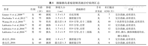 | Limmer S et al,2009[6] | 女 | 80 | 胰尾 | 1.5×1.5 | 经皮穿刺 | 无 | 7 | 完全消融,症状消失 |