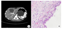 临床诊断:肝囊性占位性病变,考虑囊腺瘤。因患者及家属手术意愿强烈,于2017年5月4日行剖腹探查术。术中见肝左内叶一枚大小约6.8 cm×6.0 cm囊性肿块,突出肝脏表面,质地柔软,有完整包膜,与周围肝组织边界清楚。因无法确定肿物性质,遂完整切除肿物并送快速病理,回报考虑肝脏子宫内膜异位囊肿,未行扩大手术。术后病理诊断同术中快速病理结果,免疫组化示:PR(+),ER(+),见图1B。临床诊断为肝脏子宫内膜异位症(hepatic endometriosis,HEMs)。患者术后第5天康复出院,半年后复查无肿瘤复发及血清学指标异常。