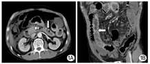 1A:冠状位影像提示小肠不全性梗阻,左、中上腹小肠肠壁下积气,肠坏死可能(箭头所示);1B:矢状位影像提示右中下腹小肠肠壁异常强化,考虑炎性病变(箭头所示),腹腔积液