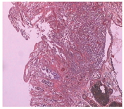 患者男性,47岁,因"持续性腹胀、腹痛3 d,症状加重伴黑便1 d"急诊入院,既往有痛风10余年,长期服用强的松、保泰松、布洛芬治疗,余无特殊病史。入院查体:体温38.5℃,脉搏110次/min,呼吸26次/min,血压90/65 mmHg(1 mmHg=0.133 kPa),意识清楚,稍烦躁,皮肤巩膜无黄染,双肺呼吸音粗,全腹稍膨隆,上腹部压痛明显,轻度肌紧张,肠鸣音1~2次/min。实验室检查:白细胞2.85×109/L,血小板30×109/L,谷丙转氨酶115 U/L,谷草转氨酶419 U/L,血尿素氮16.8 mmol/L,肌酐439 μmol/L,Ca2+ 1.65 mmol/L,淀粉酶2 790 U/L,血糖12.8 mmol/L,降钙素原80.91 μg/L,脑钠肽9 719 pg/ml。入院诊断为急性胰腺炎、休克代偿期、MODS、痛风。积极采取禁食、胃肠减压、解痉镇痛、抑制胰液分泌、补液扩容、营养支持和中药等综合治疗措施,病情无缓解,腹痛、腹胀进一步加重。入院后10 h腹部增强CT报告:小肠不全性梗阻,左中上腹小肠肠壁下积气,肠坏死可能;右中下腹小肠肠壁异常强化,考虑炎性病变;腹腔积液;胰体、尾部强化不均匀伴周围积液,双侧胸腔积液(图1)。诊断性腹腔穿刺抽出暗红色血性液体,考虑SAP合并肠坏死可能。征得家属同意,急诊剖腹探查,术中发现约有100 cm的末端回肠坏死和右半结肠坏死,胰体、尾部坏死。行末端回肠切除术+右半结肠切除术+胰体尾坏死组织清除胰周引流术+回肠造瘘术。术后转ICU进一步治疗,因病情重,术后第3天因多器官功能衰竭死亡。术后病理示肠壁细胞坏死,大量炎性细胞浸润(图2)。