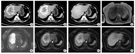 根据Tao等[6]报道,AH的CT平扫多表现为边界清晰的等或稍低密度类圆形不均质肿物,轮廓分明;在增强CT扫描的动脉期,病灶边缘可表现出明显的环形和结节状强化,静脉期病灶会进一步增强,而延迟期图像上则显示出均匀持续增强。本例患者肿物的增强CT与上述表现基本一致,普美显增强MRI则表现为动脉期可见明显不均匀周边强化,门脉期及静脉期可见强化向内充填。可见肝AH的影像学表现与海绵状血管瘤及血管肉瘤相似,由于目前报道的病例数较少,尚没有关于此病统一的影像学诊断标准。由于无法排除海绵状血管瘤,因此肝穿刺活检仍需慎重。本例患者术中可见肿瘤与周围正常肝组织界限清楚,有不连续包膜存在,因此手术以肿瘤局部切除为主,切缘距肿瘤边缘1 cm以上为宜。目前尚没有该肿瘤接受介入治疗及药物治疗的相关研究报告。