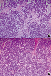 入院后请血液内科、重症监护病房(intensive care unit,ICU)及产科会诊后认为腹腔积液原因不清,建议行腹部、盆腔CT检查,给予对症支持治疗并予地塞米松促胎肺成熟,并告知病危。患者于2016年8月5日晚转入ICU,并于2016年8月7日在超声引导下行腹腔穿刺,进一步腹腔积液检测示甲胎蛋白106.10 ng/ml,糖基抗原CA125 161.2 U/ml。CT检查:双下肺微结节;左侧腹腔局部肠管(结肠)增厚并可见肿块影,肝脏多发厚壁囊性病变;子宫呈妊娠样改变;腹腔及盆腔大量积液。2016年8月8日请全院会诊。CT室意见:结肠肿块性质不明,与周围无明显粘连,可考虑淋巴结肿大,不排除肿瘤可能,建议行加强CT或MRI;普外三科意见:肠腔包块性质不明,患者无明显消化道病史,且近日大便未解,仅CA125高及CT结果尚不能确诊肿块性质;普外一科意见:肝区病变为肝囊肿,但腹腔积液由低蛋白引起可能性大,纤维蛋白原降解产物高与胎儿有关;产科意见:患者目前心率快,大量腹腔积液,对胎儿不利因素较多,可考虑终止妊娠。经患者及家属同意后,于2016年8月8日孕28周+6晚在连续硬膜外麻醉下行"剖宫产术+开腹探查"术。术中顺利娩出一男活婴,早产儿,无脐带绕颈,羊水清亮,体重1 400 g,1、5及10 min Apgar评分分别为8、9及9分(转儿科治疗1个月后出院)。探查腹腔见大网膜上广泛分布大小不等质中结节,肝脏布满肿块,最大径线约6 cm。术中诊断考虑腹部肿瘤侵及小肠、结肠,并大网膜转移可能性大,取大网膜、小肠系膜数枚,肝脏取部分病灶活检,脐带和胎盘同时送病理检查。术中大网膜、小肠系膜、肝脏部分病灶病理检查结果提示:小圆形细胞恶性肿瘤;免疫组化检测:波形蛋白(Vimentin)(+),神经纤维丝蛋白(neurofilament protein,NF)(+),突触素(synaptophysin,SYN)(+),CD56(+),CD99(+),CD117(+),P16(+),P53(+),诊断骨尤文肉瘤/外周原始神经外胚层肿瘤(图1)。脐带与胎盘组织病理检查结果未发现肿瘤细胞及肿瘤组织(图2)。