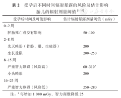部分孕妇意外接受了辐射性影像学检查,由于其胎儿辐射暴露剂量远远低于50~100 mGy,不推荐作为终止妊娠的医疗指征[3]。但孕期,尤其是早孕期,因病情需要特殊类型检查或多次检查导致累积暴露剂量超过50~100 mGy时,可根据孕周及胎儿辐射暴露剂量大小(表2[3,10])综合分析其风险;同时,是否继续妊娠还需要尊重孕妇及家属意愿,并参考相关法律法规。