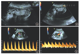 Khedr等[1]报道了胎盘畸胎瘤与胎儿无心无定型畸形、脐肠系膜管囊肿和肠道器官样分化具有类似的特点,因此在诊断中应注意鉴别。胎盘绒毛膜血管瘤是最常见的胎盘良性肿瘤,与胎盘畸胎瘤有较多重叠的特点,但胎盘绒毛膜血管瘤的超声特点一般为胎盘实质内母体面或胎儿面边界清晰的圆形或椭圆形实性中低回声,瘤体内可见树枝状、网格状或蜂窝状的丰富血流信号,常为单发,位置不定,大小不一。超声多普勒对病灶内血流信号的探测是鉴别血管瘤的关键。妊娠结局更多地取决于瘤体的大小,而非组织成分。通常超过4 cm的肿块即可能引起胎儿贫血、羊水过多等并发症,需要测量大脑中动脉收缩末期峰值流速,以预测胎儿是否合并贫血[17]。病理检查可见胎盘绒毛膜血管瘤的瘤体由大量血管腔隙与少量疏松的纤维结缔组织构成,是确诊的方法。另外,本例在早孕期行绒毛活检术,可能会形成胎盘内血肿,随着时间延长可能出现液化、钙化等,鉴别诊断时需要排除。胎盘内血肿通常超声表现为血肿内部探测不到血流信号,为弱光点回声,而且血肿可能随着孕周的增加逐渐缩小。但该病例孕晚期才发现,且超声表现与血肿差异较大,因此考虑与早孕期行绒毛活检术无关。