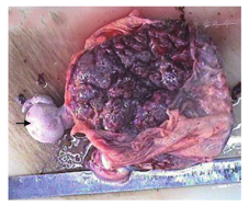 有学者提出,胎盘畸胎瘤应与胎儿无心畸形相鉴别[14]。胎盘畸胎瘤与胎盘之间没有脐带,有时通过一短蒂连接;而胎儿无心畸形通常有1条包含有脐静脉与脐动脉的脐带;畸胎瘤通常是一个多样化组织的集合,包括骨与软骨;胎儿无定型无心畸形具有一定的轴向组织,如头颅、脊柱、内部器官、或肢体等[14]。一胎无心畸形亦称双胎反向动脉灌注序列征,是一种特发于多胎妊娠的罕见畸形,表现为双胎妊娠一胎儿心脏缺如、退化或无功能,常伴有多个器官发育异常或缺如,而另一胎正常;双胎通过脐动脉形成动脉-动脉吻合。可采用多普勒超声检查脐动脉检查,加以排除。本例在早孕期超声并未发现宫腔内多个妊娠囊,并且这一异常肿物内回声未探及丰富的血流信号;产后病理检查发现该肿物位于羊膜与绒毛膜之间,内含软骨,缺乏脐带,无一定的结构器官与骨骼系统。自最初超声发现该病灶至分娩后进行大体检查时,肿瘤没有明显增大。这些表现在一定程度上支持胎盘畸胎瘤的初步诊断,而组织病理学检查进一步明确了畸胎瘤的诊断。