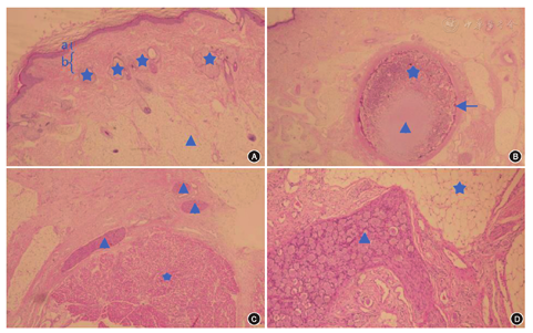 患者30岁,孕2产1,末次月经2017年7月8日。2018年4月16日,患者因"停经40周+2,阴道分泌物增多半天"入院。患者于孕11周在本院因"夫妻双方地中海贫血基因携带(女方:--SEA/αα,β-28/βN;男方:αα/αα,βIVS-2-654/βN)"行绒毛活检术,绒毛快速基因检测提示21、18、13号染色体数目均未见异常,绒毛地中海贫血基因检测提示β地中海贫血-28突变杂合子。中孕期排畸超声未发现明显异常;孕33周+超声发现胎盘胎儿面内异常回声,大小为6.9 cm×3.1 cm,以无回声为主,其内可见强回声光团;彩色多普勒血流显像未探及明显血流信号,不排除胎盘畸胎瘤可能(图1)。孕35周+盆腔MRI提示子宫底部左侧、胎盘左上缘偏内侧可见囊性不规则混杂信号影,病灶大小约4.5 cm×3.9 cm×2.7 cm,边缘清晰,边缘可见包膜,考虑畸胎瘤可能,也不排除死胎可能(图2)。2018年4月18日(孕40周+4)经阴道分娩一活女婴,出生体重3 320 g,外观未见畸形,1、5和10 min Apgar评分均为10分。胎盘于胎儿自然娩出后5 min自然完整娩出。病理检查:胎盘大小为21 cm×18 cm×2 cm,胎儿面光滑,母体面完整;在胎盘边缘的羊膜和绒毛膜之间发现1个6.5 cm×5.0 cm×3.0 cm的光滑椭圆形被覆皮肤的结节,质地中等,无蒂(图3)。剖开后切面局部可见软骨。显微镜检查可见完整皮肤结构,有表皮、真皮、皮肤附属物、脂肪组织、肌肉、软骨、骨、血管及神经组织(图4),病理诊断:(胎盘边缘)成熟型囊性畸胎瘤。患者于产后2 d出院。出院后随访1年,患者及其女一般情况良好。