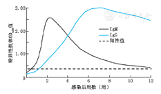 特异性IgM和IgG是机体对病原体引发的特异性体液免疫应答而产生的抗体。特异性IgM在感染后最早产生,感染后3~10 d即可在血液中检测到,并于2~3周达到高峰后下降,多数在感染后2~3个月消失,极少数可持续6个月、甚至1年。因此可将特异性IgM用于早期诊断。特异性IgG通常不是IgM消失后才产生的,而是在特异性IgM产生后1周内即可检测到,然后逐渐升高,并于6~8周达到高峰;病原体清除后,IgG抗体滴度可有所下降,但可持续数年至数十年,甚至终身(图1)[8]。因此单纯检测特异性IgG不能确定现症感染。特异性IgM检测是诊断急性感染的重要手段,但IgM是以五聚体形式存在的,检测时容易出现假阳性,因此需要动态检测,并同时结合IgG抗体滴度的动态变化,才能提高其诊断的准确性[8]。