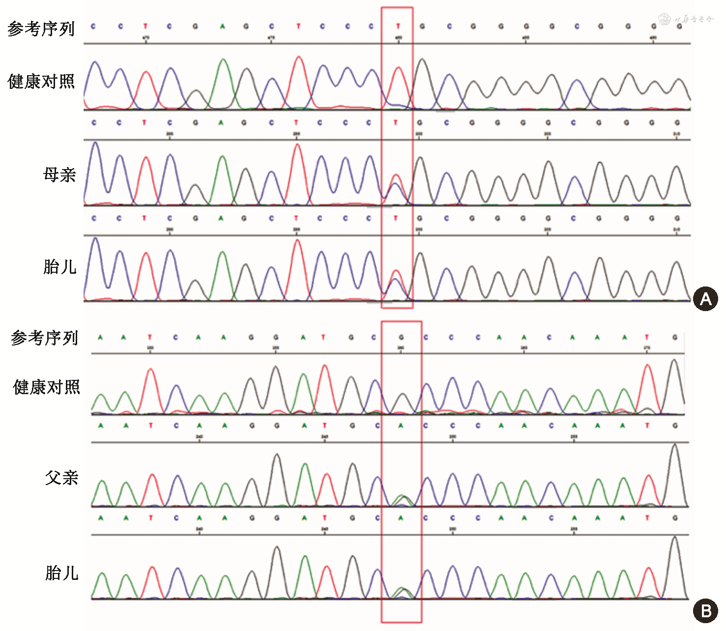 4.转醛醇酶缺乏症的治疗及预后:转醛醇酶缺乏症目前尚无确切有效的治疗方法。1/3患儿死亡,多数于新生儿期发病,6个月内死亡,婴儿期主要以肝功能障碍为主,远期多数认知功能正常,少部分可能存在肌张力减退。本例患儿目前1岁余,脏器功能和血常规大致正常,尿液气相色谱-质谱检测未见明显异常,仍需继续随访评估。本例患儿母亲有不良孕产史,本次早孕期超声提示与第一胎相似的胎儿贫血,通过产前诊断脐带血检查胎儿有三系减少,外院定期监测胎儿超声,孕34周就诊于本院,全外显子组测序明确转醛醇酶缺乏症,此时已孕37周,且转醛醇酶缺乏症表型差别比较大,有预后好的报道,结合多学科产前胎儿会诊、产前咨询意见,孕妇选择继续妊娠。患儿的外观特征及临床表现均符合转醛醇酶缺乏症。患儿生后的实验室检查异常与其兄高度相似,但程度较轻,经长期服用乙酰半胱氨酸、维生素E、维生素C及维生素AD,目前结局良好。以上药物是否在治疗上发挥了重要作用目前尚不明确。对于转醛醇酶缺乏模型小鼠的研究及临床病例经验,对乙酰氨基酚可诱发肝功能衰竭或肝癌发生,伴有脾肿大及甲胎蛋白升高[11]。转醛醇酶缺乏症患儿应避免使用对乙酰氨基酚。目前关于乙酰半胱氨酸的药物研究表明,长期口服乙酰半胱氨酸可预防对乙酰氨基酚诱导的肝衰竭,与甲胎蛋白持续正常化及稳定的临床情况相关[12, 13]。