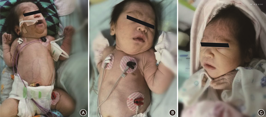 患儿女,第2胎第2产。母亲33岁,末次月经2019年10月,孕24周+开始外院产前超声发现胎儿大脑中动脉流速峰值进行性增高、双侧鼻骨低回声、肝右叶长度正常高值、心胸比增大、心包少量积液和胎盘增厚,定期监测胎儿超声。脐带血穿刺查血常规示白细胞和血红蛋白低,血小板正常。羊水甲胎蛋白6 126 U/ml,巨细胞病毒IgM抗体阴性,抗人球蛋白试验阴性。结合既往不良生育史,考虑可能存在遗传病,故于孕34周时转诊于广州市妇女儿童医疗中心要求进一步产前诊断。