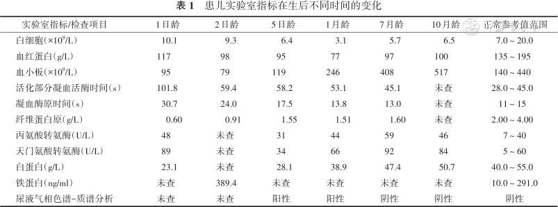 孕妇2020年5月29日转入本院后脐带血穿刺染色体核型分析、染色体微阵列分析、快速分子诊断、地中海贫血基因、耳聋基因、脊髓性肌萎缩症基因检测均未见异常;全外显子组测序提示TALDO1基因存在c.462-2A>G剪接变异和c.574C>T(p.R192C)罕见错义变异的复合杂合变异(图1),分别遗传自母亲及父亲,依据美国医学遗传学与基因组学学会(American College of Medical Genetics and Genomics,ACMG)变异分类指南,该变异为“2类-可能致病”。孕妇遗传咨询后选择继续妊娠,孕38周+1阴道分娩,羊水清,无胎膜早破,新生儿出生体重2 760 g,1、5、10 min Apgar评分分别为8、9和9分,转新生儿重症监护病房。新生儿生后稍有气促、呻吟、青紫,体格检查示肺部湿啰音,腹部膨隆、腹壁静脉显露,肝脾无明显增大。有特殊体征,包括多毛、皮肤松弛/皱褶多、反蒙古样倾斜、眶下折痕、鼻梁塌陷、低耳位和阴蒂肥大(图2)。生后脾脏进行性增大,肝功能轻度异常,凝血酶原时间、凝血酶时间及活化部分凝血活酶时间延长,纤维蛋白原低,凝血因子活性均降低,血小板和血红蛋白降低,血清铁蛋白轻度升高(表1)。生后第6天心脏彩超示动脉导管未闭及房水平左向右分流。尿液气相色谱-质谱分析见大量木糖醇。血浆氨基酸分析以及肝胆胰脾、双肾、肾上腺、头颅超声和脑电图均正常。结合产前脐带血外显子组测序结果,患儿确诊“转醛醇酶缺乏症”。患儿生后予有创辅助通气1 d,补充维生素K1、输注新鲜冰冻血浆2次及纤维蛋白原1次,合理喂养等对症支持治疗,血小板及血红蛋白无进行性下降,肝功能、凝血功能明显改善,生后第8天好转出院。出院后一直服用乙酰半胱氨酸、维生素E、维生素C及维生素AD。定期门诊随访发现患儿持续贫血,但血红蛋白呈缓慢上升趋势,血白细胞、血小板、肝酶、白蛋白、凝血功能、纤维蛋白原、血脂基本维持在正常水平。尿液气相色谱-质谱分析提示木糖醇增高、核糖醇逐渐减少。7、10月龄连续2次尿液气相色谱-质谱分析基本正常(表1)。随访期间监测患儿体格和神经运动发育基本正常。10月龄可独站片刻,可手膝爬,能拇食指捏物,会发“DADA”音,1岁可独走。特殊体征逐渐不明显,现1岁3月龄仍可见双手背及颈背部皮肤较松弛且皱褶多,继续随访中。