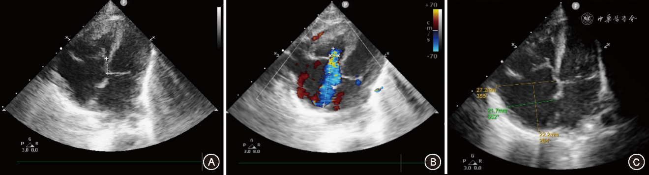 生后2 d心电图检查示:窦性心律,心率120次/min;PR间期缩短,时限75 ms;QRS波群时限108 ms,起始部粗顿形成δ波,V1导联QRS波群呈rS型,Ⅰ、aVL导联δ波呈正向;继发性T波改变,提示B型心室预激(图1)。超声心动图检查示:左、右心房增大,右心房明显,心室大小测值及室壁厚度、活动度均未见明显异常;三尖瓣隔瓣距二尖瓣环间距约7.79 mm,三尖瓣前瓣稍冗长,余各瓣膜形态及活动未见明显异常(图2);降主动脉与左肺动脉间可见分流束,宽约4.8 mm,左向右分流,收缩期分流速度约2.05 m/s,估测肺动脉压约40 mmHg(1 mmHg=0.133 kPa)。提示三尖瓣下移畸形,动脉导管未闭,房间隔卵圆孔未闭,轻度二尖瓣反流,重度三尖瓣反流,轻度肺动脉高压。生后5 d患儿出现心动过速,心电图检查示:无窦性P波,心室率298次/min;窄QRS波,时限60 ms;提示阵发性室上性心动过速(图3)。患儿三尖瓣下移程度较轻,经内科治疗后病情好转,未出现快速性心律失常,出院后定期随访。