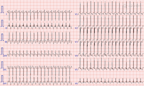患儿母亲孕期在本院定期产前检查,系统超声及胎儿超声心动图检查均未提示异常,孕38周+6M型超声检查发现胎儿室上性心动过速,胎心率283次/min,剖宫产终止妊娠。