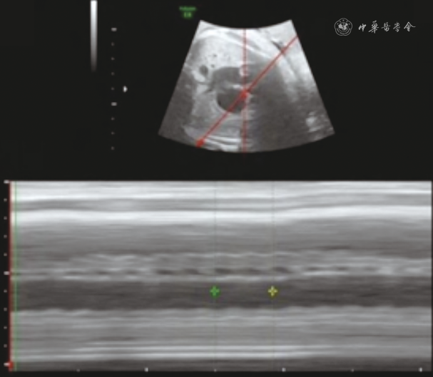 追溯患儿产前超声心动图未能检出三尖瓣下移畸形(图4),但胎龄38周+6时M型超声检查示胎儿心率快,283次/min,律齐,呈1∶1房室传导,VA间期短,诊断为室上性心动过速(图5)。