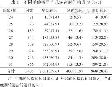 3 405例极早产儿中,早期转运组2 031例(59.6%),延迟转运组406例(11.9%),晚期转运组968例(28.4%)。