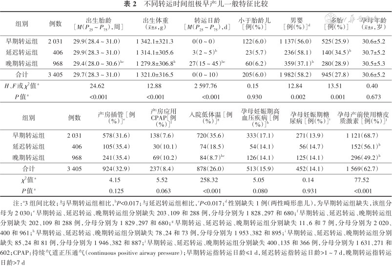 注:a3组间比较;与早期转运组相比,bP<0.017;与延迟转运组相比,cP<0.017;d性别缺失1例(两性畸形患儿),为早期转运组缺失,该组分母为2 030;e早期转运、延迟转运、晚期转运组分别缺失203、109和288例,分母分别为1 828、297和680;f早期转运、延迟转运、晚期转运组分别缺失202、109和288例,分母分别为1 829、297和680;g早期转运、延迟转运、晚期转运组分别缺失11、6和7例,分母分别为2 020、400和961;h早期转运、延迟转运、晚期转运组分别缺失78、24和73例,分母分别为1 953、382和895;i早期转运、延迟转运、晚期转运组分别缺失85、24和81例,分母分别为1 946、382和887;j早期转运、延迟转运、晚期转运组分别缺失400、135和366例,分母分别为1 631、271和602;CPAP:持续气道正压通气(continuous positive airway pressure);早期转运指转运日龄≤1 d,延迟转运指转运日龄>1~7 d,晚期转运指转运日龄>7 d