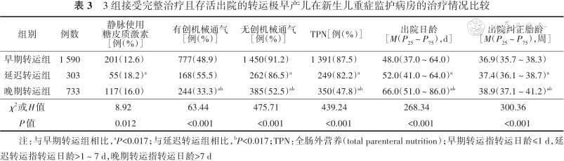 3组接受完整治疗且存活出院的转运极早产儿在新生儿重症监护病房的治疗情况比较