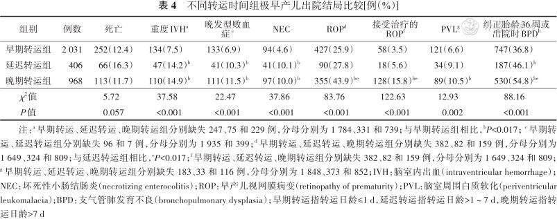 注:a早期转运、延迟转运、晚期转运组分别缺失247、75和229例,分母分别为1 784、331和739;与早期转运组相比,bP<0.017;c早期转运、延迟转运组分别缺失96和7例,分母分别为1 935和399;d早期转运、延迟转运、晚期转运组分别缺失382、82和159例,分母分别为1 649、324和809;与延迟转运组相比,eP<0.017;f早期转运、延迟转运、晚期转运组分别缺失382、82和159例,分母分别为1 649、324和809;g早期转运、延迟转运、晚期转运组分别缺失183、33和116例,分母分别为1 848、373和852;IVH:脑室内出血(intraventricular hemorrhage);NEC:坏死性小肠结肠炎(necrotizing enterocolitis);ROP:早产儿视网膜病变(retinopathy of prematurity);PVL:脑室周围白质软化(periventricular leukomalacia);BPD:支气管肺发育不良(bronchopulmonary dysplasia);早期转运指转运日龄≤1 d,延迟转运指转运日龄>1~7 d,晚期转运指转运日龄>7 d