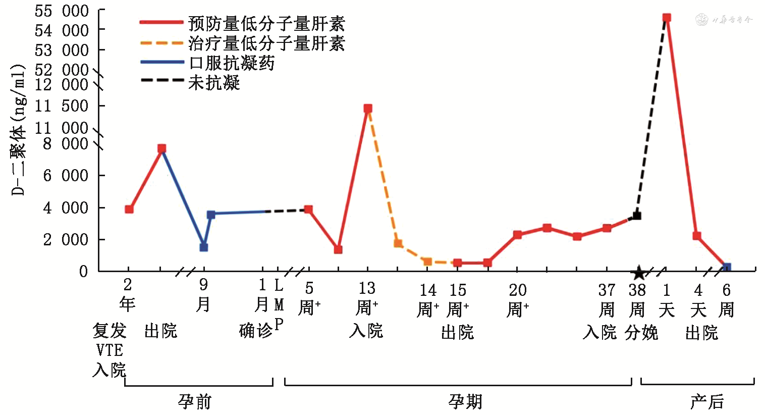 本例患者虽无家族性VTE病史,但孕前曾有2次下肢深静脉VTE事件,孕前长期接受利伐沙班抗凝并经基因检测确诊为PCD,结合其既往反复发作的VTE病史,预测妊娠期VTE发生风险极高,故孕期有抗凝指征。但患者从备孕至孕5周+未抗凝,孕5周+后才开始接受预防量LMWH抗凝直至孕13周+因可疑新发下肢深静脉血栓形成改为治疗量LMWH,2周后因彩超提示绒毛膜下血肿增大,在权衡抗凝及出血风险后改为预防量LMWH。本次入院后再次评估血栓形成风险,凝血功能正常后于孕38周+1计划性引产,分娩前计划性停用LMWH,因可疑胎儿窘迫行产钳助产,产后24 h重启LMWH抗凝。因考虑孕前曾有2次VTE病史,产后42 d停用LMWH改为利伐沙班口服并停止母乳喂养。产后随访2个月,母儿一般情况良好。
