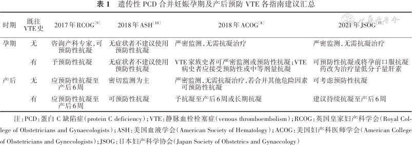 注:PCD:蛋白C缺陷症(protein C deficiency);VTE:静脉血栓栓塞症(venous thromboembolism);RCOG:英国皇家妇产科学会(Royal College of Obstetricians and Gynaecologists);ASH:美国血液学会(American Society of Hematology);ACOG:美国妇产科医师学会(American College of Obstetricians and Gynecologists);JSOG:日本妇产科学协会(Japan Society of Obstetrics and Gynaecology)