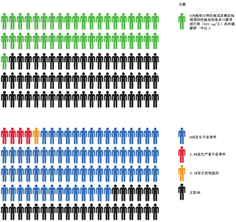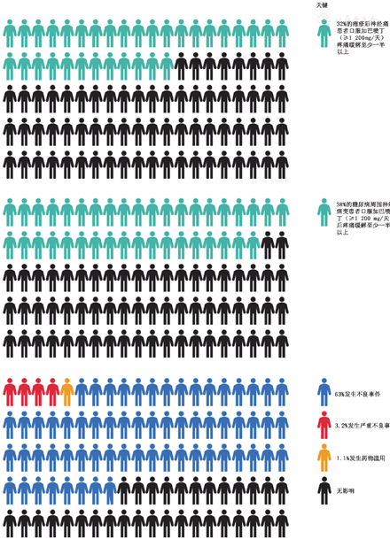 持续8周及以上每天服药的患者中,约有40%带状疱疹后神经痛或糖尿病性周围神经病的患者发现疼痛至少减轻了50%