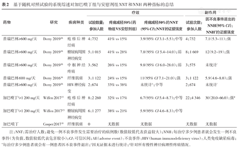 基于随机对照试验的系统综述对加巴喷丁组与安慰剂组NNT和NNH两种指标的总结