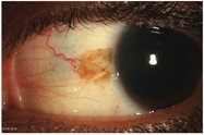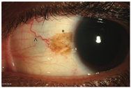 图1可见楔形色素病变,伴轻微的穹顶样结膜增厚(图2,星号所示)。可见扩张的、开瓶器状滋养血管紧邻病变(图2,箭头所示)。