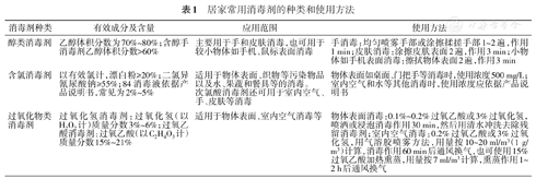 含氯消毒剂的作用时间和消毒效果与有效氯浓度直接相关,而过氧化物类消毒剂也与其过氧化氢或过氧乙酸质量分数直接相关。百姓居家常用消毒剂种类和使用方法见表1。
