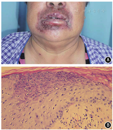 患者女,64岁,因口腔、外阴等部位溃疡伴疱疹反复发作4个月余,于2020年4月24日入住我院风湿免疫科。4个月前,患者出现口腔、外阴、肛周溃疡,伴肿痛,之后前胸及右侧乳房、腋窝逐渐出现红斑脓疱,部分破溃、糜烂,渐脱皮。就诊于当地医院,考虑白塞病,给予地塞米松及对症治疗(具体不详)1周,症状较前缓解。治疗10 d后停药,3 d后上述症状再次加重,遂来我院风湿免疫科就诊。患者患高血压病近20年,平素服用氨氯地平降压治疗,因血压控制欠佳,自行将氨氯地平改为替米沙坦40 mg口服、2次/d(至溃疡出现已服药3周);患2型糖尿病20年,应用诺和锐30笔芯20 U皮下注射、2次/d,二甲双胍0.25 g口服、3次/d降糖治疗,血糖控制尚可。家族史无特殊,否认药物及食物过敏史。